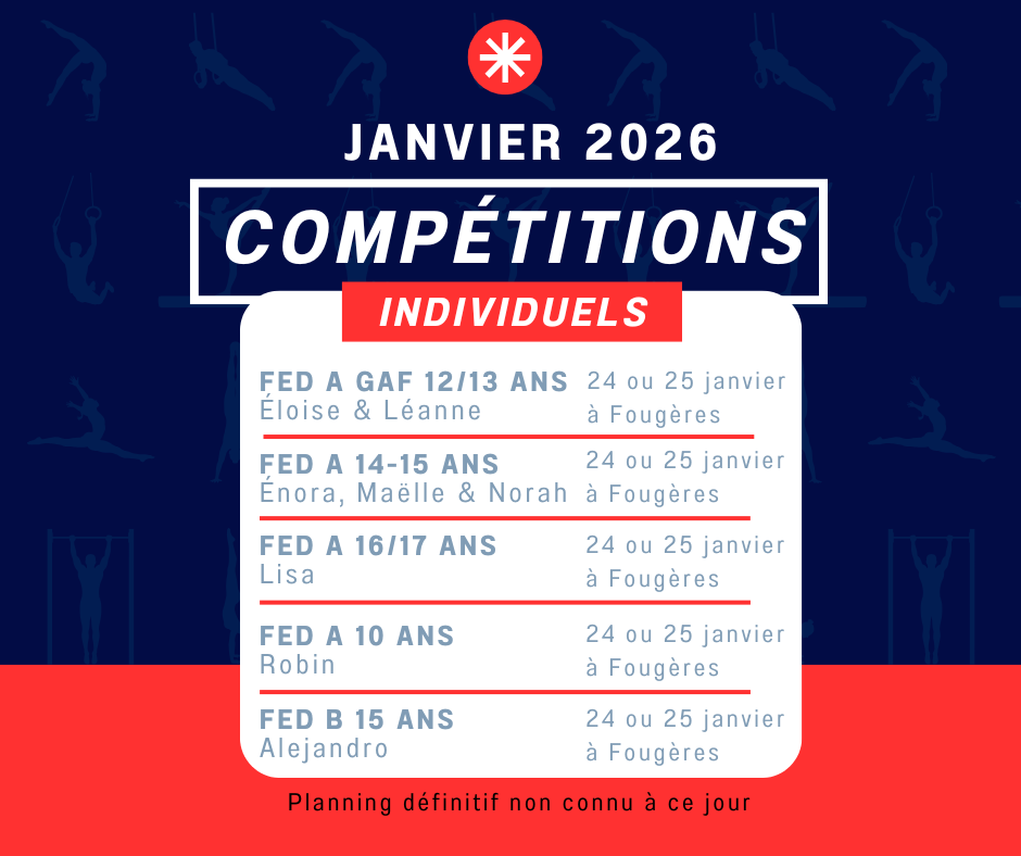 Le mois de janvier s’annonce intense pour nos gymnastes engagés en compétitions individuelles. Plusieurs gymnastes représenteront fièrement le CJF Gymnastique lors du week-end des 24 et 25 janvier à Fougères, dans leur catégorie d’âge.
